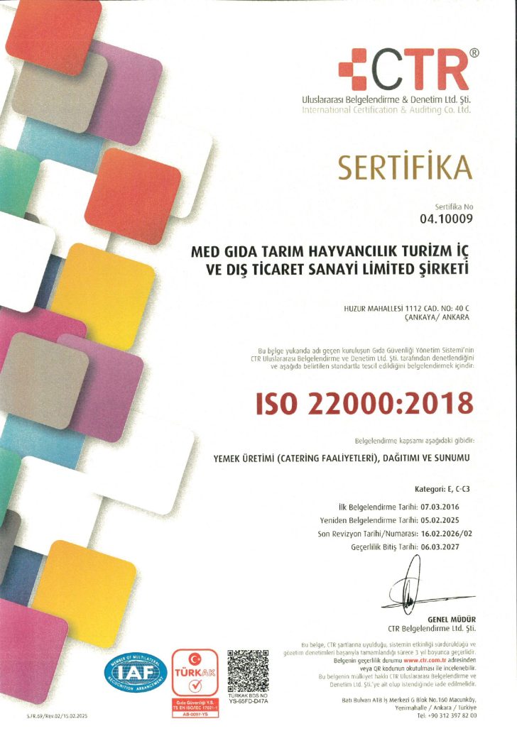 Med Yemek & Servis olarak ISO 9001:2015 Kalite Yönetim Sistemi ve ISO 22000:2018 Gıda Güvenliği Yönetim Sistemleri’ni uygulayarak %100 gıda güvenliğini sağlıyoruz. Hijyenik ve lezzetli yemekler üretmek için tedarikçi seçiminden son ürün size ulaşana kadar her süreçte titizlikle çalışıyoruz.